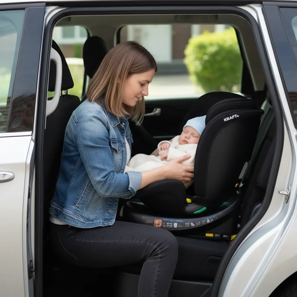 Koltuk isofix baza üzerinde 360 derece döndürülerek öne veya arkaya sabitlenir.